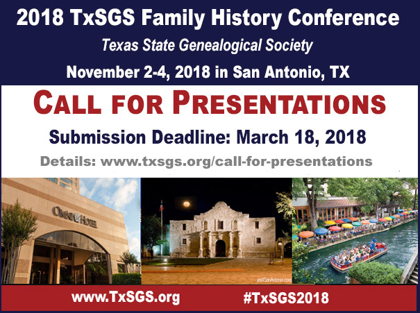 The Texas State Genealogical Society announces a Call for Presentations for the 2019 Family History Conference. This year’s conference will be held October 11-13, in Houston, Texas, at the Omni Houston Hotel Westside, 13210 Katy Freeway, Houston, TX 77079, 281-558-8338.
