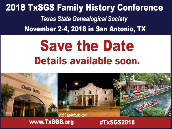 Sign up for our TxSGS Email list to receive announcements when the program and schedule are released, when conference registration opens and when the discounted hotel reservations open up for the 2018 Family History Conference.