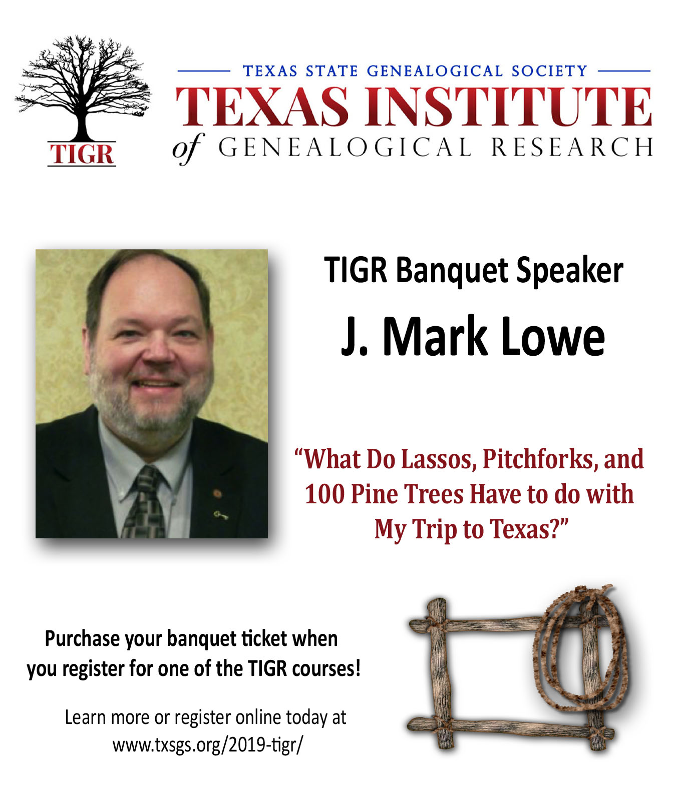 What do these things have to do with banquet speaker J. Mark Lowe’s trip to Texas for the 2019 Texas Institute of Genealogical Research?